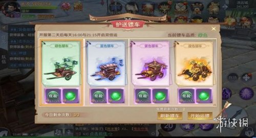 押镖可获得大量经验,玩家可通过消耗绑定元宝刷新镖车,镖车等级越高,获得的经验越多。每天16点至16点30分、21点15分至22点押镖可获得双倍经验奖励。