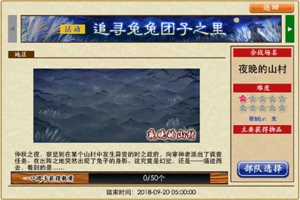 选择刀剑男士,编成队伍后,通过点击出阵进入合战场选择界面,点击进入【追寻兔兔团子之里】后,选择出阵地区【夜晚的山村】。