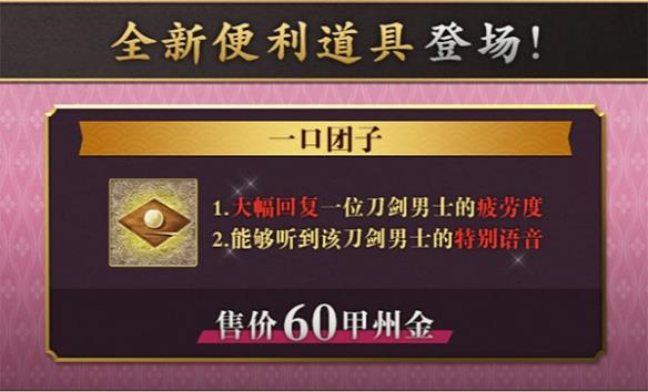 本次活动结束后,仍可在万屋购买【一口团子】,依旧可以使用道具【一口团子】恢复刀剑男士疲劳值,并听到特殊语音。