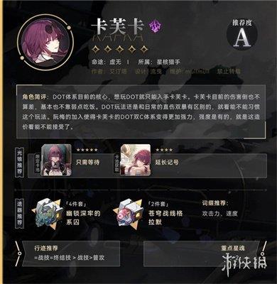 卡芙卡是dot体系的入门角色,是否抽取卡芙卡与她的强度以及dot体系的强度无关,简而言之,如果想玩dot体系,那么就必须抽取卡芙卡。