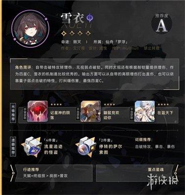 雪衣是一位混伤C角色,在使用雪衣时,会出现高额的击破特攻,这也意味着高额的增伤效果,她的终结技本身也带有很高的增伤,只是缺少双暴属性,因此面板不会很高,但这个数值在四星C角色中已经算是非常出色的了,可以作为五星C角色的下位替代。