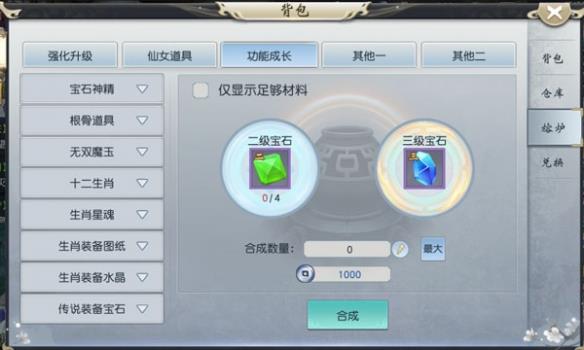 3、炼炉系统中有五个分类,分别为强化升级、仙女道具、功能成长和其他。其中,强化升级包括强化石、符类、装备升级和品质神铸;仙女道具包括仙女觉醒、仙女召唤卡和仙女品质;功能成长包括宝石神精和根骨道具等等;其他则是玫瑰花、时装等。各种材料的合成一应俱全,有如开挂。