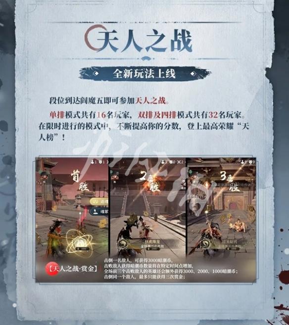 1、新模式天人之战即将上线!段位到达阎魔五即可参加天人之战。