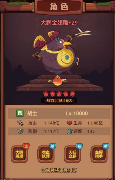大鹏金翅雕作为战士,天妖血脉的被动可以给它带来不错的血量以及攻击提升。也其具备一定伤害的同时也有站场的能力。基础技能大鹏展翅可以攻击两个生命最少的攻击目标并且施加流血效果,不仅对流血目标后续有增伤还有减治疗的效果,更是可以在击杀目标后回复自身最大生命值并且增加自身狂暴状态强化伤害进一步增强后续作战能力。