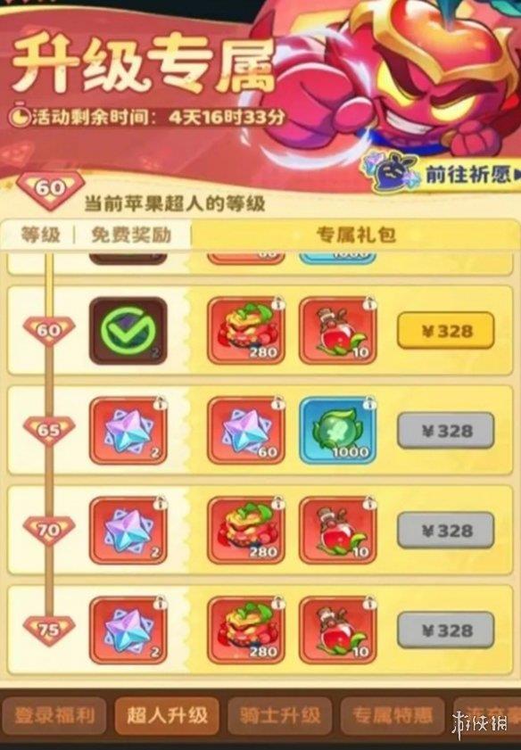 每将苹果超人的等级提升,之后符合档位便能领取祈愿星。