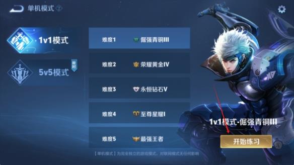 2、点击后进入单机模式,在单机模式中可以选择1V1和5V5的玩法,选择想要体验的模式点击开始练习