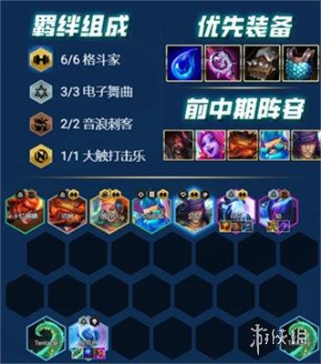 羁绊搭配:6格斗家、3电子舞曲、2音浪刺客、1大触打击乐