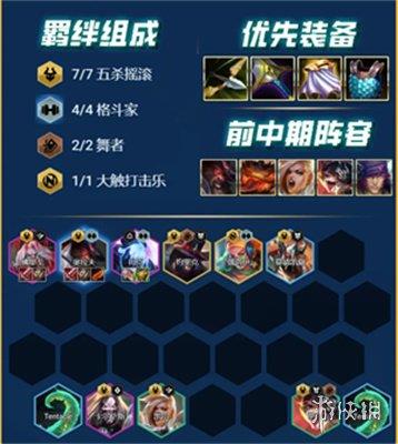 羁绊搭配:7五杀摇滚、4格斗家、2舞者、1大触打击乐