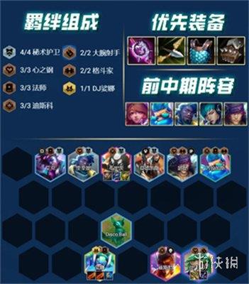 羁绊搭配:4秘术护卫、3心之钢、3法师、3迪斯科、2大腕射手、2格斗家
