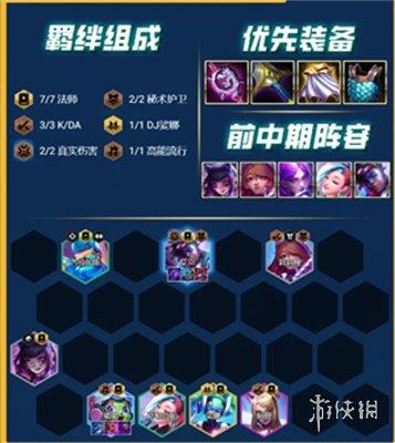 羁绊搭配:4爵士乐、2秘术护卫、2真实伤害、2护卫、2大腕射手、3K/DA、3超级粉丝