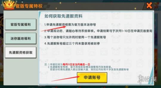 2、必须使用的是官方版本(官网地址)的迷你号,这样才能申请先遣服。接着,点击页面下方的申请账号按钮。