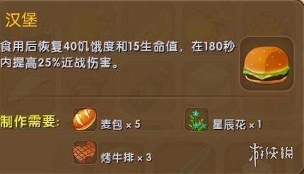 7、汉堡效果:食用汉堡可以恢复40点饥饿度和15点生命值;在180秒内提升25%的近战伤害,适合在战斗中使用。