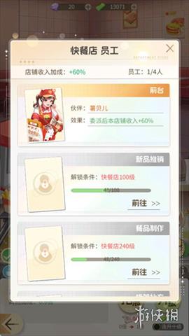 利用 60%的收入加成,可以快速提升营收。随着店铺等级的提升,可以逐步解锁新品推销、餐品制作等岗位,进一步完善员工体系。