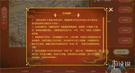 4、当修复进度达到100%时,您需要对壁画进行上色,并将作品分享到广场,即可免费领取永久装扮临江仙颂,点击页面上的我的作品可以查看并分享您的作品,而点击作品广场则可以欣赏其他冒险家分享的作品。