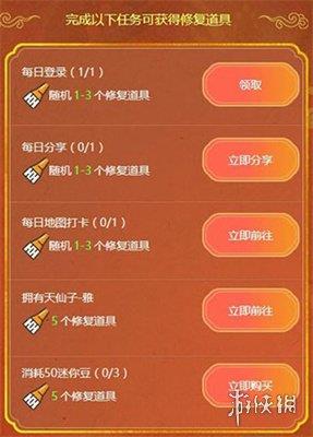 3、本次活动要求玩家完成右侧的活动任务,以获得修复道具,使用这些修复道具来修复壁画,并根据修复进度来获取奖励。