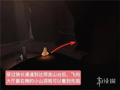 2、穿越一条狭窄的小径后,你将来到预言山谷的大厅,在这里,找到右侧最明亮的山洞并进入,武士裤先祖就在其中等待你的探访。