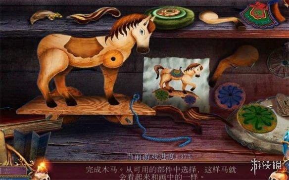 玩家需按照图示拼装木马,具体步骤为:将四个轮子安装在木板的四周,坐垫放置在马背上,再用蓝色绳子系在马脖子上,即可完成拼装。
