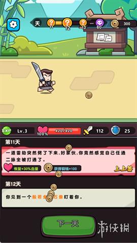 在第11天,玩家可能会触发雷劫上上签,恢复30%血量并获得100铜钱,使属性和资源得到双重增益。每一天的气运都不同,玩家也有可能触发下下签。因此,需要灵活应对每次随机事件。