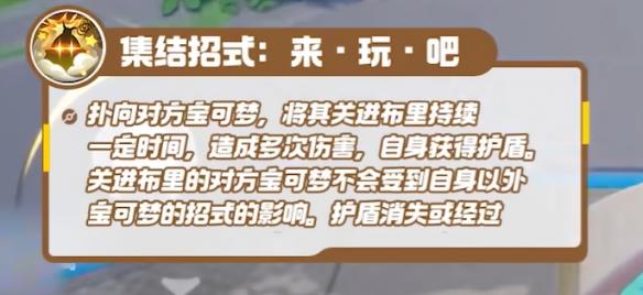 扑向对方宝可梦。将其关进布里持续一定时间,造成多次伤害,自身获得护盾。
