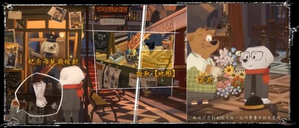 赫本火车站,售票员汪汪前拾取【赫本地图】,用纪念币兑换【信封】;在大厅里购买花朵