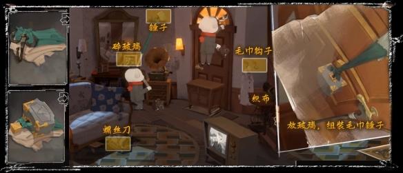 旧城区,逃离房间,拾取桌上照片后的【碎玻璃】和沙发上的【螺丝刀】,用螺丝刀拧开门口旁边螺丝,获得【毛巾】【钩子】,用裁缝机将两条毛巾连起来,组合成【毛巾钩子】,钩出上面的【吊锤】,在拆开毛巾组装【毛巾吊锤】,移动柜子到门前,门上插入碎玻璃,并用毛巾吊锤打开门