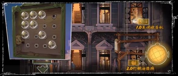 顶台前,摆动灯泡(形状左上箭头),指引小孩关闭收音机,再打翻油漆桶后,前往剧院