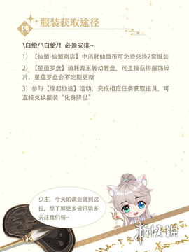 1、仙盟-仙盟商店中消耗仙盟币可免费兑换7套服装。