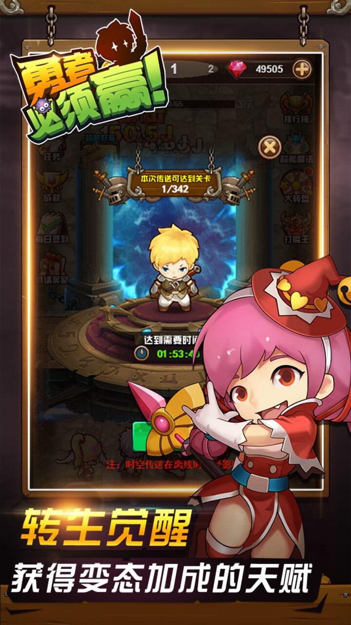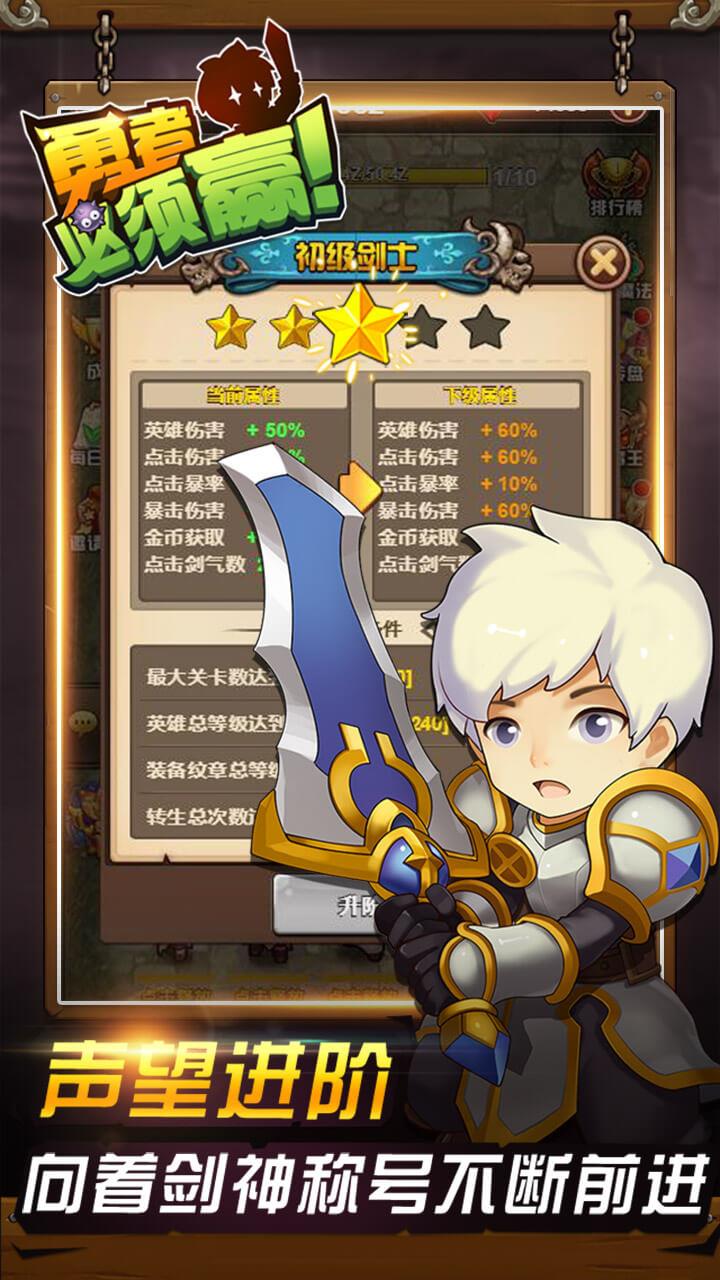 勇者必须赢是一款由新快游戏开发的手机游戏,在这里你将扮演一位勇敢的战士,在充满挑战的世界中展开冒险之旅!支持android系统运行,并且全程使用中文界面哦~游戏获得8星高分评价呢!文件大小仅有1.69MB,在手机上轻松运行毫无压力~快来体验这段激动人心的冒险旅程吧!