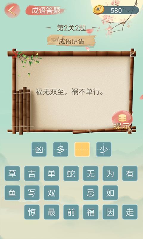 5、打开提示功能,获取成语提示,帮助通过关卡。