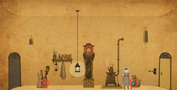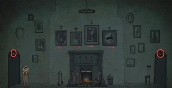 拉动右侧墙体上摇杆使房间内的吊灯下落,熄灭吊灯可获得线索。
