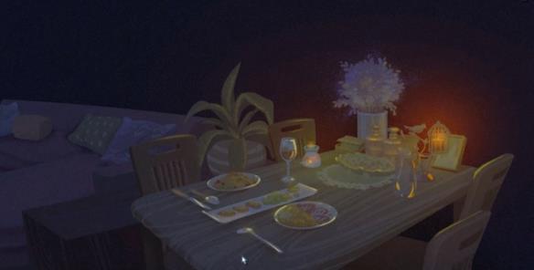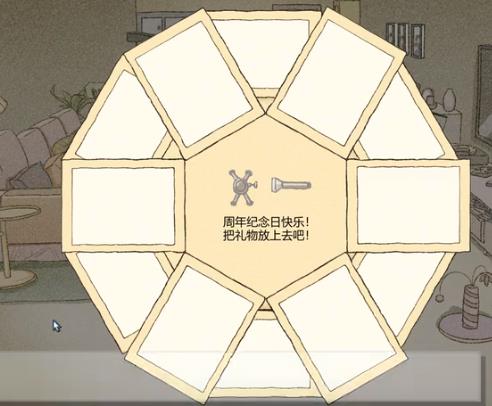 8.按照之前方法再来一遍(准备纪念日的时候),在冰箱里盘子上拿到钥匙,然后打开房间里的铁盒,拿到笔后去阳台,把两个心连起来,拿墙上礼物灯光中的项链,洗衣机旁的纸条,返回客厅打开礼物盒。