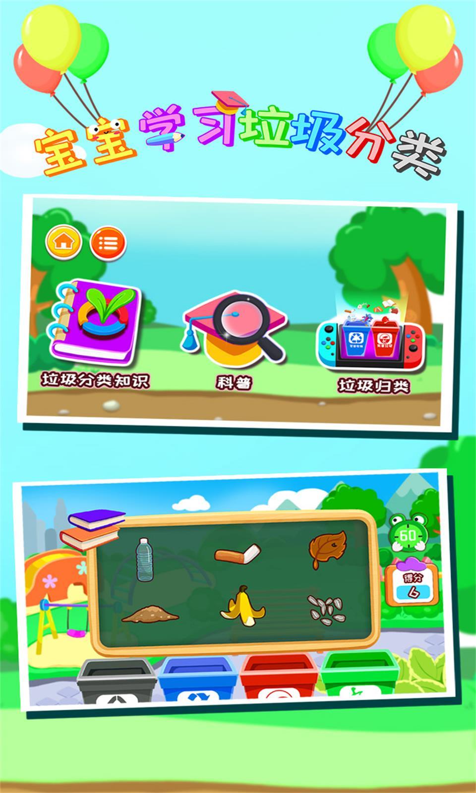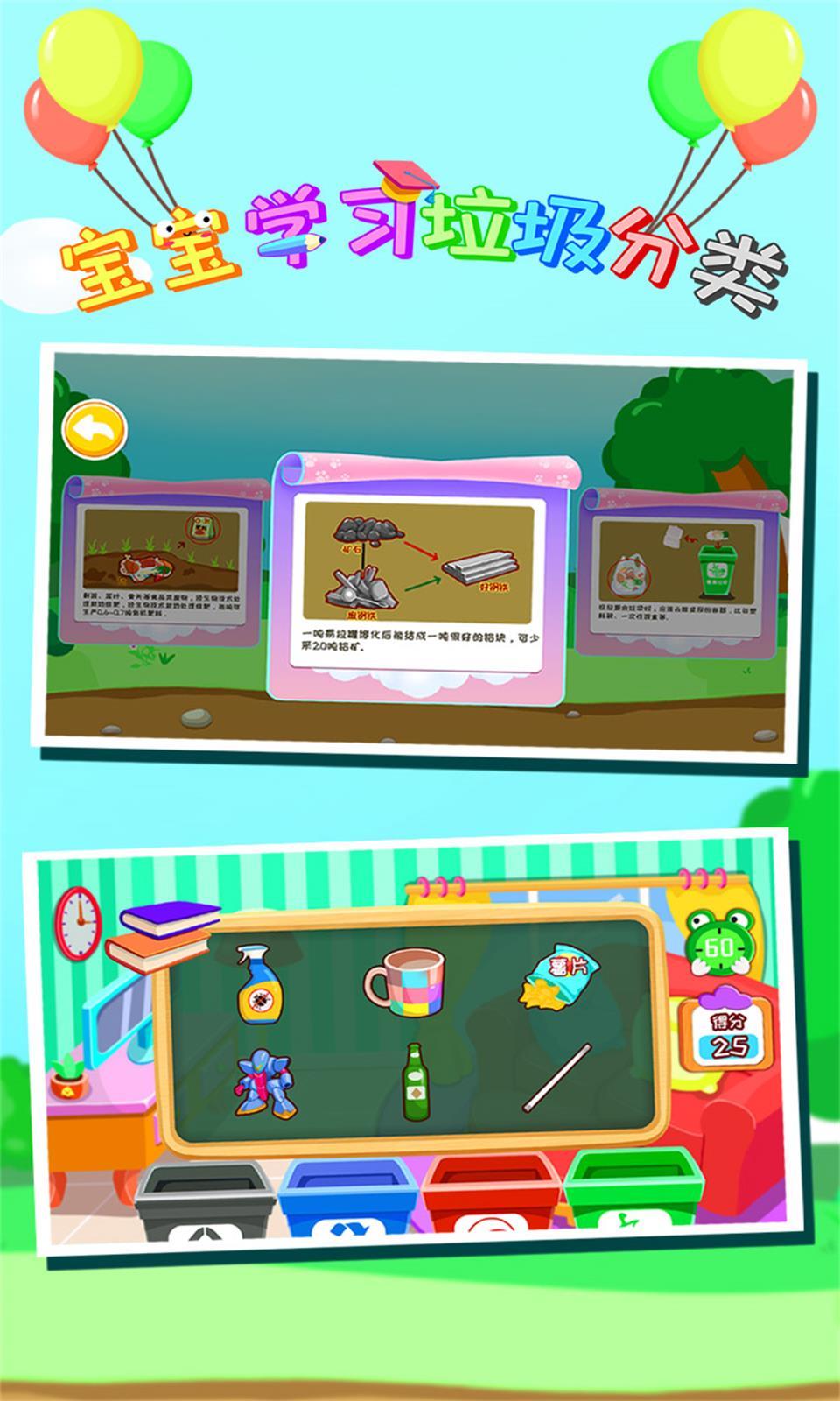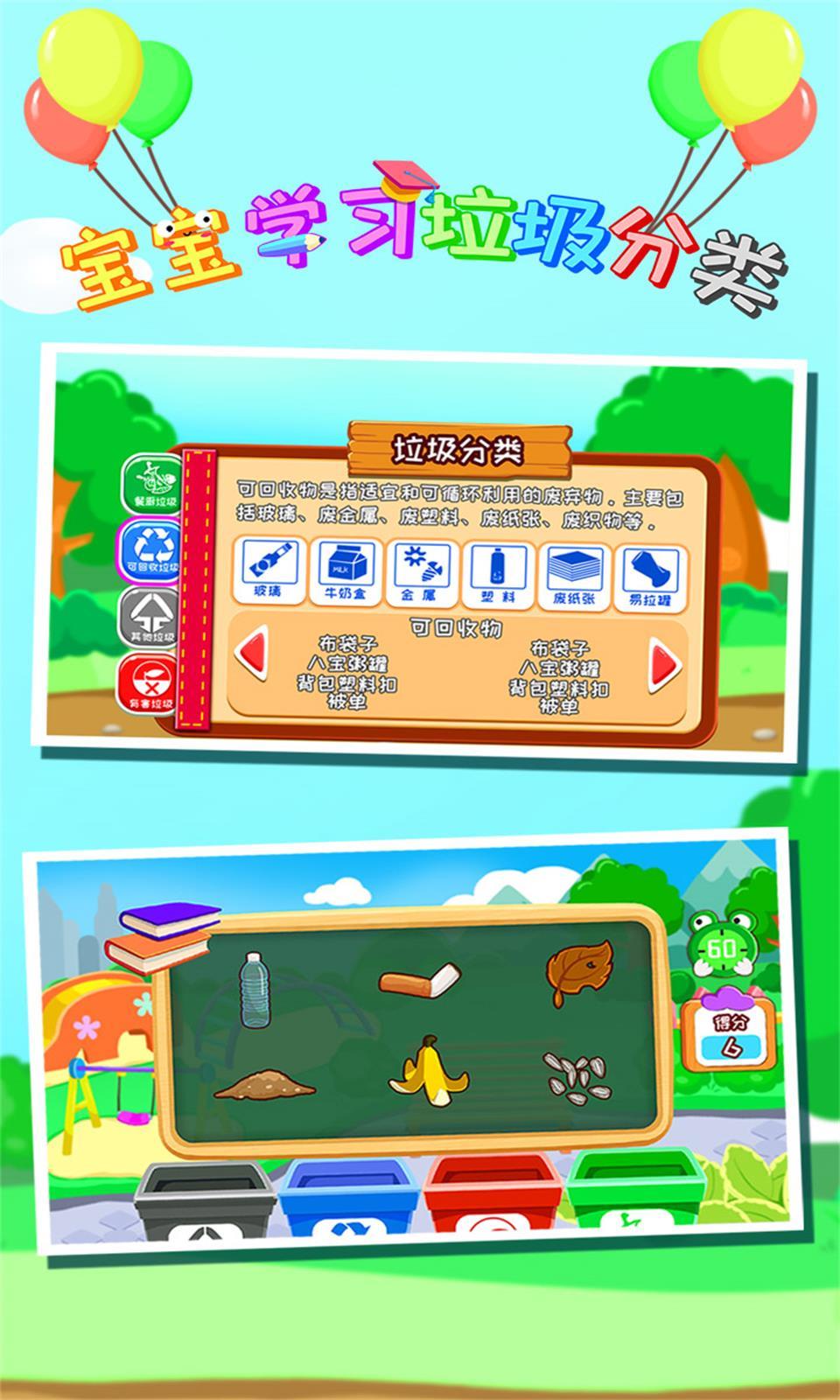 《宝宝学习垃圾分类》是一款儿童启蒙教育游戏。在游戏中,让孩子们学习打扫卫生,促进小朋友对垃圾分类的认知,提高动手能力全面发展的益智科普指南。通过基础学习,简单有趣的玩法,轻松掌握小游戏中的垃圾分类课程,培养小朋友们了解环保卫生、爱惜环境的好习惯。