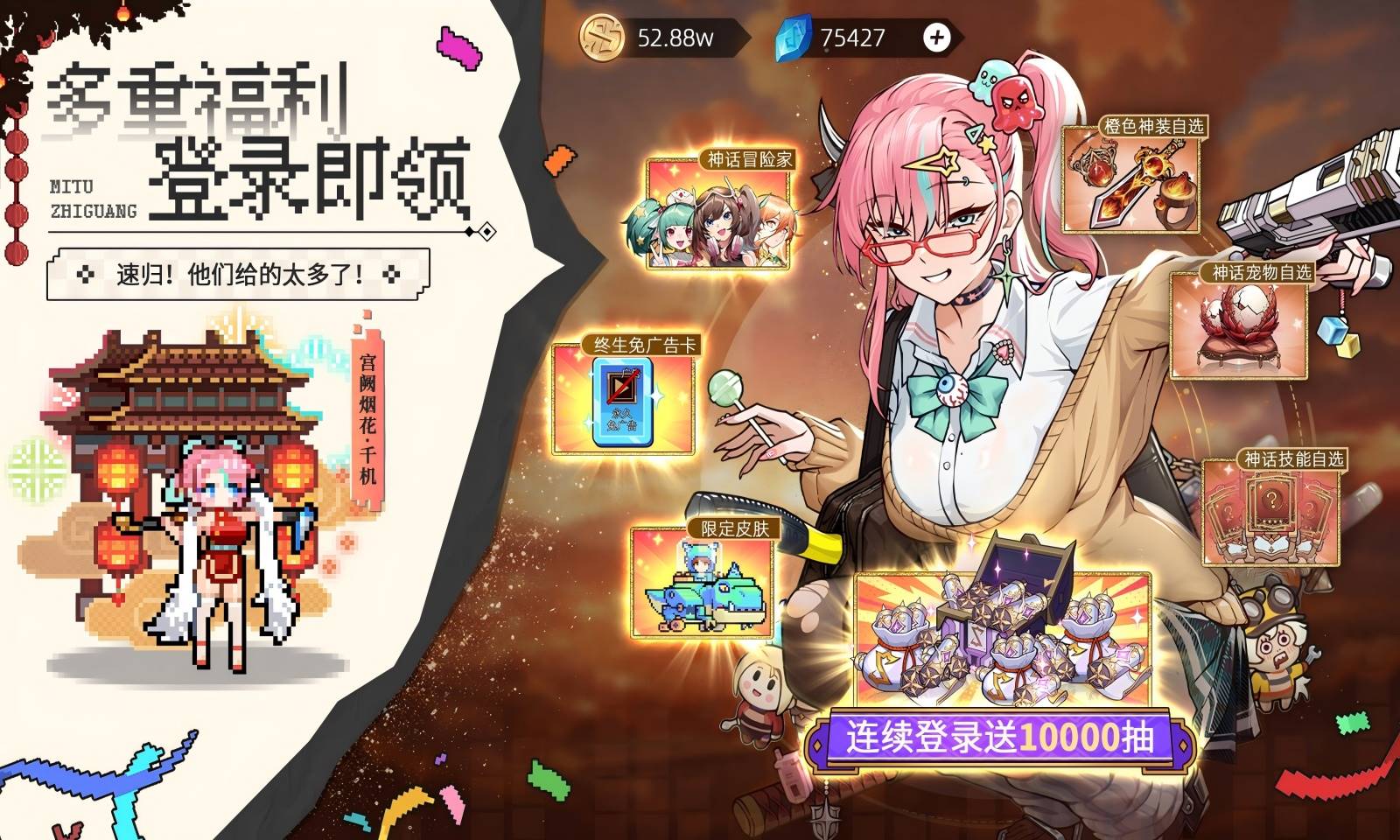 1.【重要更新】:- 新增冒险家【缠蝶丝奈流】,全新流派链接流登场;-新增8个全新技能!薪火相传、连锁反应、灵魂链等。技能限定UP池限时开启;-新增10全新神器,神器限定UP池限时开启;-开启【涅槃】全新赛季!新增10个全新涅槃技能,球形闪电、疯狂前雨等,70-1解锁;-开启 2 月【狂欢技】!新增生命之弧、脾气火爆、双赢、圣盾之剑等技能;-开启活动【春节大庆】!将赠送新冒险家、新技能、限定头像等奖励,2.4开启,8-5解锁;-开启活动【赶大集】,可兑换各类珍贵材料,包括秘银、龙鳞锤等。2.4开启,14-1解锁;-开启活动【每日红包】,每日超好运的红包免费领。2.4开启,14-1解锁;-开启活动【送送送】,免费好礼多天连续送。2.20开启,1-2解锁;-开启活动【达成礼】,消耗彩钻领取超多福利。2.4开启,1-2解锁;-开启活动【乐翻天】,将获得蓝钻等珍贵道具!2.15开启,9-1解锁;-上线新副本【合合牌】,迷途现在也能打牌了,非常早期beta测试阶段,38-1解锁;-奈流神话限定皮肤上线,2.4至2.23开启;-神话限定皮肤【烟火传奇流萤】返场,2.24至3.5开启。