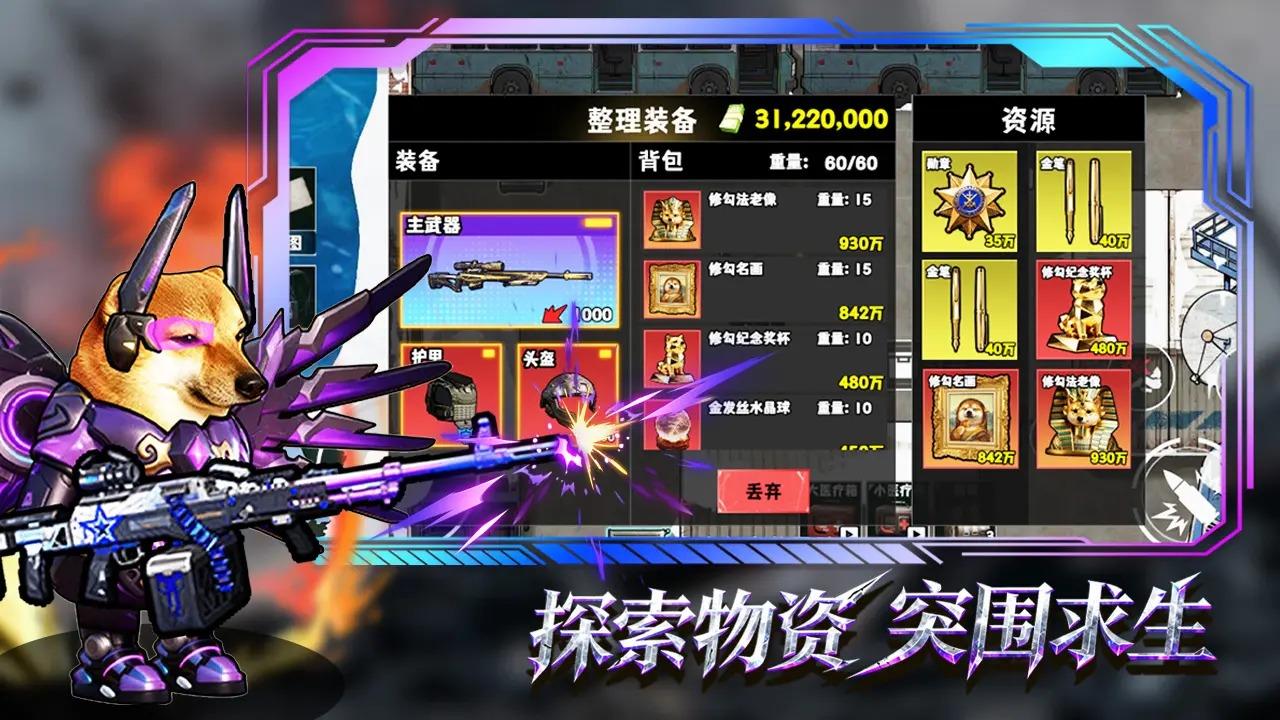 《猫狗搜打撤》是一款有趣的生存类射击游戏,请你带领修勾,在枪林弹雨中谋求一线生机,当然,高风险带来的是高回报,在逃亡的过程中有丰富的物资等你搜索!只要成功逃生,你背包中的物资将尽数归你所有!心动不如行动,快来试试吧!