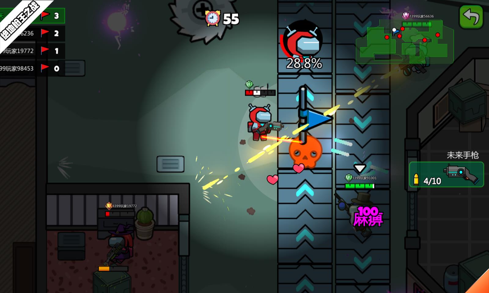《绝地枪王之战》是一款乱斗射击游戏。游戏设定有四种模式,生成模式、乱斗模式、防守模式和守旗模式。十五个升级段位。游戏故事背景设定在未来,一艘开往遥远星系的飞船,因为资源耗尽,船员发生了暴乱,你作为其中一员,唯一要做的就是战斗和生存!