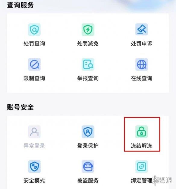 3、在账号安全栏选择【冻结解冻】选项。