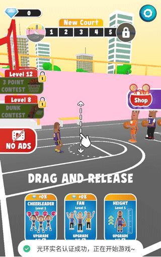 2、拖动角色起飞,瞄准篮筐,将篮球扔进篮筐,获得相应分数。