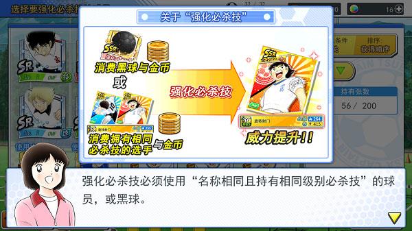 强化必杀技需要使用名称相同且持有相同级别必杀技的球员或是黑球,在这里需要强调的是相同级别必杀技,A级的旋转射门是不能强化S级的旋转射门滴。而黑球也是有一定限制的,