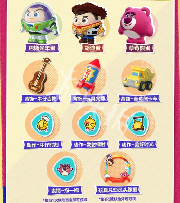 2、隐藏福利:集齐胡迪、巴斯光年、草莓熊三款联动外观,可免费领取牛仔吉他玩具火箭草莓熊卡车三款限定背饰。