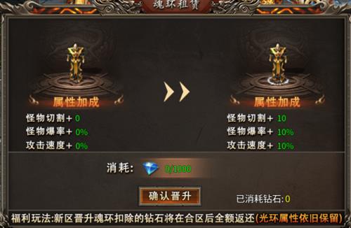 1、新区开区,先别急着冲锋陷阵,把目光投向魂环租赁。消耗钻石升级魂环,你将瞬间获得怪物切割、怪物爆率和攻击速度的强力属性加成。想象一下,别人还在为打一只怪费尽周折时,你凭借高怪物切割属性,轻松就能让怪物血条见底;高怪物爆率让你随时都有可能爆出珍稀装备;攻击速度加成更是让你的输出如狂风暴雨般猛烈。关键是,这笔前期投入的钻石,在一合区后会全额返还,而属性却会一直保留,稳赚不赔的买卖,谁能不心动?