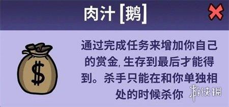 肉汁鹅:完成任务可增加自身赏金,但必须生存到最后。杀手只有在与你独处时才能对你下手。