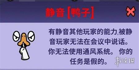 静音鸭:拥有静音其他玩家的能力,被静音的玩家无法在会议中发言。同时,你无法使用通风系统,其任务为假任务。