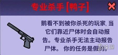 专业杀手:击杀后无法自我报告,其他鹅看不到你杀死的玩家的尸体,但当其他鹅靠近尸体时会自动报告。