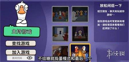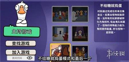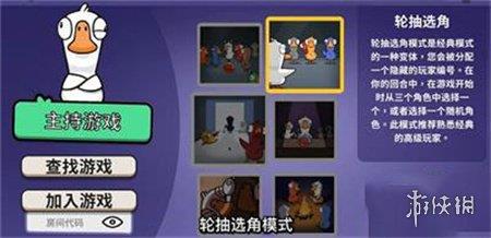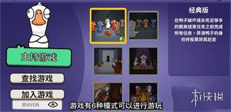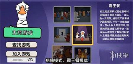 目前游戏拥有六种模式,分别为经典版、经典强化版(拥有更多角色)、猎鹅(一只鸭在规定时间内杀死所有鹅)、霸王餐、不给糖就捣蛋,最后一个模式是专门用于交朋友聊天的。
