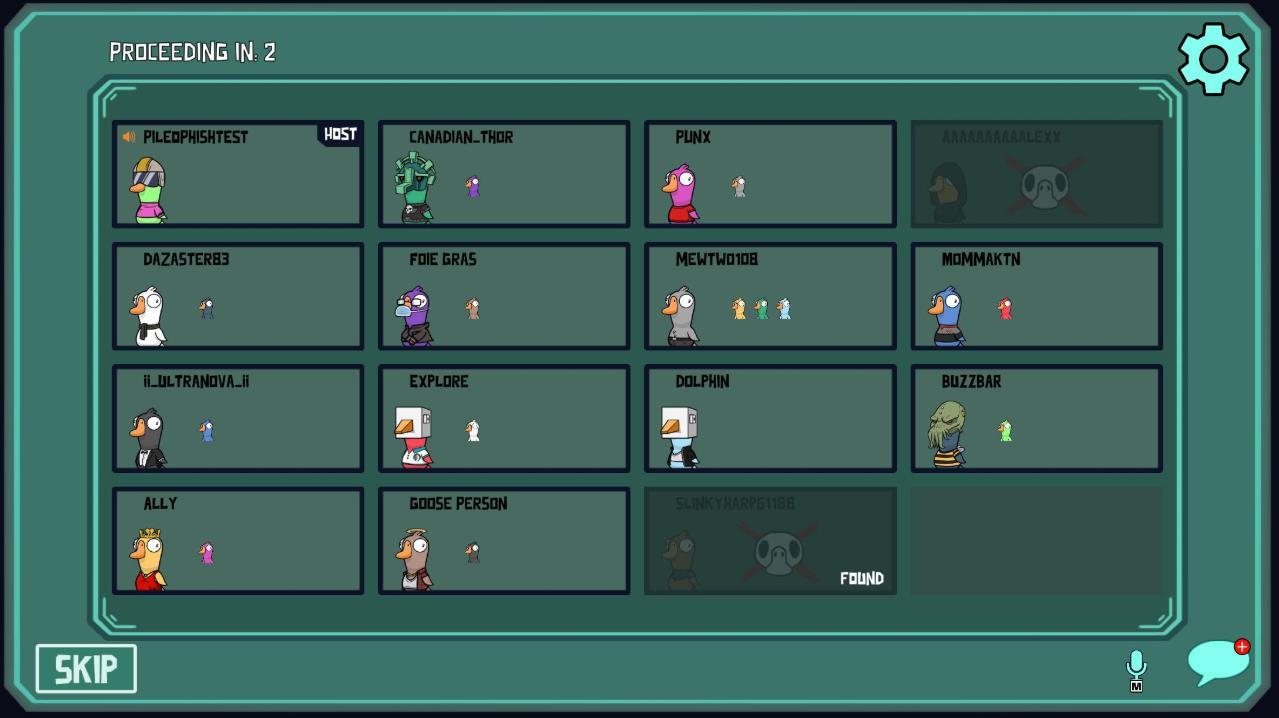 在鸭子破坏或杀死足够多的鹅以结束任务之前,鹅需要完成所有任务,找出鸭子的身份并将其投票赶走。