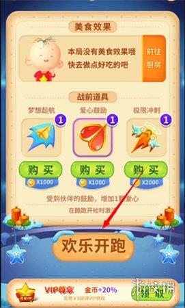 1、进入游戏,选好道具后,点击欢乐开跑按钮即可开始游戏。