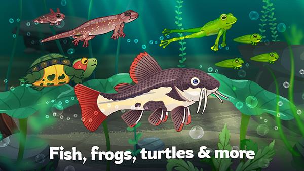 2、收集数百种淡水生物:游戏内拥有庞大的生物图鉴。你可以发现并解锁丰富多样的物种,从常见的灯科鱼、慈鲷,到古怪的青蛙、清洁鱼,甚至是神秘的蝾螈,应有尽有。