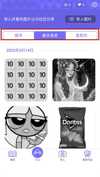 2、在社区板块玩家不仅可以与搜寻自己喜欢的图片类型,同时还支持导入本地图片进行着色,更有一键分享功能,你可以在第一时间将自己完成的作品分享给自己的好友
