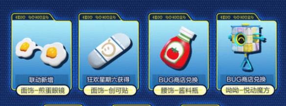 1、面饰-煎蛋眼镜、面饰-创可贴、腰饰-酱料瓶、呦呦一悦动魔方。