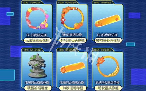 2、无限惊喜头像框、柿杮顺心头像框、柿柿顺心昵称框、秋蛋祈福雕像、聆秋语昵称框、聆秋语头像框。